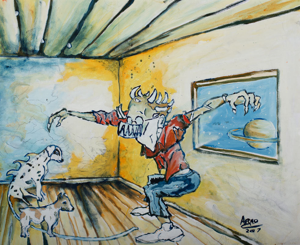 Gesturing wild movement in order to communicate with my dogs, I combine sentiment, symmetrical elements with loose line work to convey emotion.