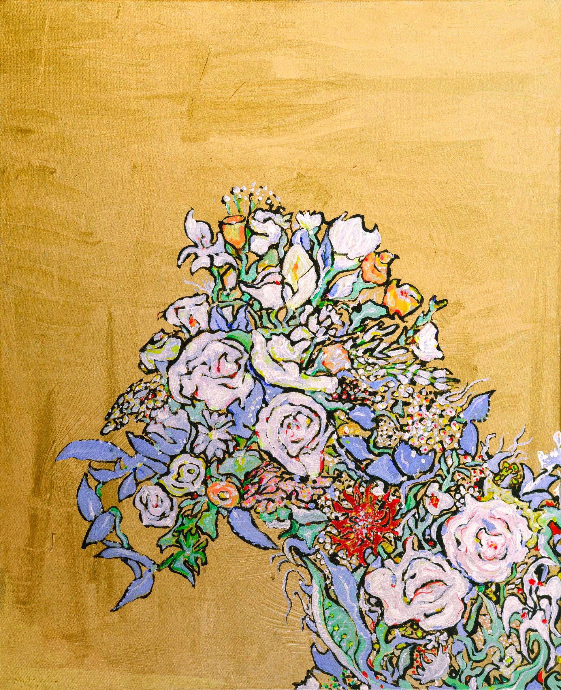 This was an earlier work, where I began experimenting with different mediums. There was no plan, except incorporating gold and flowers, but the horse's outline started to form as the painting progressed. A great example of how paintings reveal themselves to the painter.